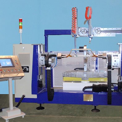 SKDB-120和SKBD200采用全數(shù)字控制。主要適用于中小形定子線圈的絕緣包扎。操作時,只需將漲型后的線圈放置在已調(diào)整好位置的氣動夾持器上。纏好絕緣帶,按動啟動按鈕即可自動對線圈進行包帶。包帶完一邊后自動翻邊包另一邊。該機的包帶頭可根據(jù)線圈的大小、形狀、按指令進行各種不同角度,不同速度的包帶,包帶的張力的調(diào)整可通過觸摸屏設定,該機具有自動、手動功能,對于大型線圈還設有機械手抓持防震動功能,同時還有多點安全保護設置。